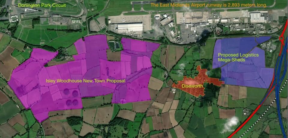 On the other side of the village, meanwhile, a planning application has been submitted by North West Leicestershire District Council on proposals developed by Harworth Group and Caesarea Development Holdings for a new town to be called Isley Woodhouse. This will be almost the size of Ashby de la Zouch, with 4250 houses and an estimated 10,000 residents. North West Leicestershire District Council has earmarked 781 acres to the south west of the airport for the new settlement – which will wipe out farmland and fields the size of almost 400 football pitches.